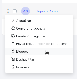 Presionar el botón de 3 puntos que se encuentra en la parte izquierda del agente, el cual le terminará desplegando un menu y debe de presionar la opción “Bloquear”.