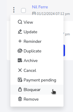Para realizar dicha acción, es necesario ir a la lista de pólizas y presionar el botón que tiene 3 puntos que esta al lado izquierdo de la póliza seleccionada. Esto hará que pueda ver un menú en el cual debe de seleccionar la opción “Bloquear”.
