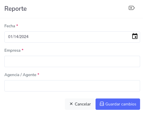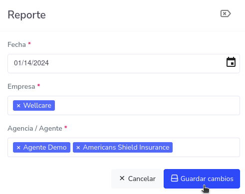 Le será mostrado una ventana emergente solicitando, la fecha del reporte, la empresa a la que le esta haciendo el reporte y la agencia o agente a la que verá el reporte. Tomando en cuenta que pueden ser varios agentes y agencias por reporte.