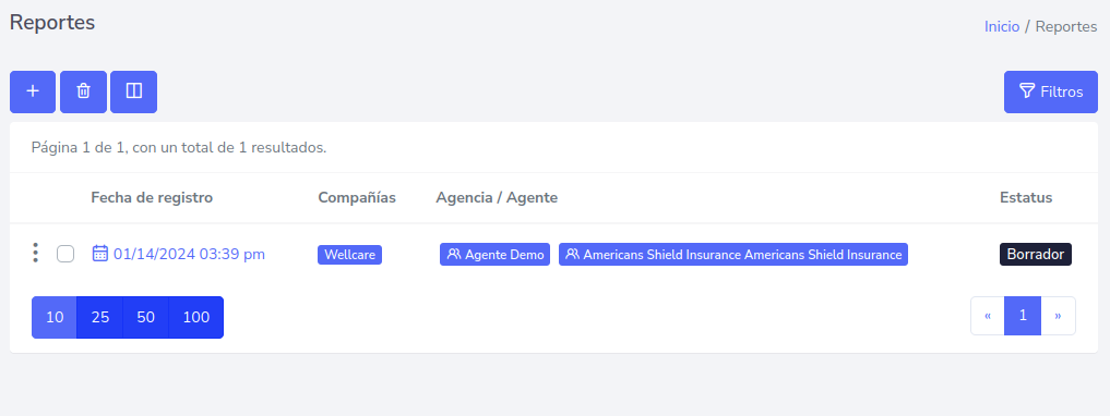 Para crear un reporte, debe de presionar el botón con el simbolo “+” que se encuentra en la parte superior izquierda.