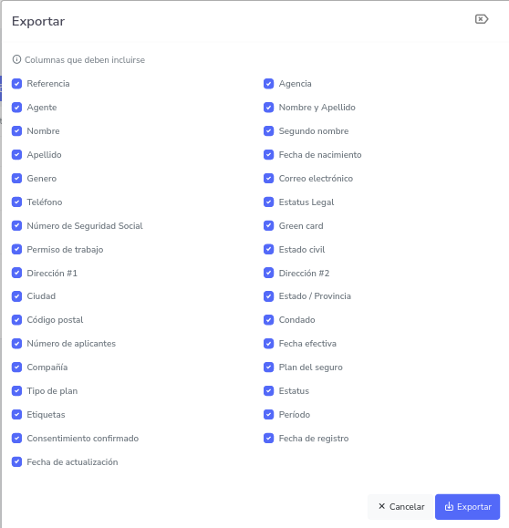 Pedirá los datos que quiere que aparezcan dentro del archivo a exportar, si los desea todos, déjelo en el estado en el que se encuentra y haga click en exportar.