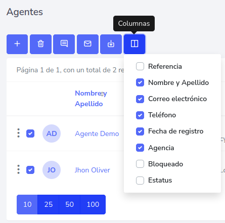 Para ordenar el como son mostrados los datos de los agentes, puede presionar el botón “Columna” que esta en la parte superior izquierda, siendo el ultimo botón.