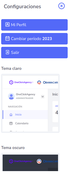 Aquí puede ir a su perfil, cambiar el periodo, salir del sistema o cambiar el color.