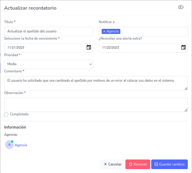 Para tener más información sobre el mismo, puede presionar sobre uno de ellos y abrirá una ventana emergente con detalles del recordatorio, a su vez podrá actualizar sus detalles.