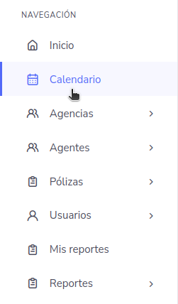 En el calendario se encuentra información sobre las notas que son adjudicadas a un usuario, en este caso son notas, que se le colocan a un agente o agencia, para que las ejecute y les de una respuesta. Para acceder al calendario es necesario ir a la barra lateral izquierda y seleccionar el calendario.