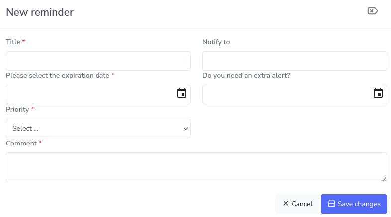 A pop-up window will appear, containing a form, you can place the title of the reminder, “Notify to” is to inform an agency or agent, in this case can be multiple users to notify, “Select due date” here, place the deadline that will have the reminder and if you want to place another extra alert, you can also add it. Finally set the priority level and a comment that helps to understand the reason for the reminder.