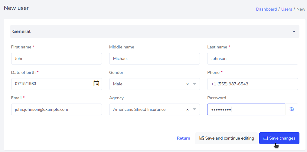 After pressing the button, a form will appear, which you must fill out to finish creating a new user.