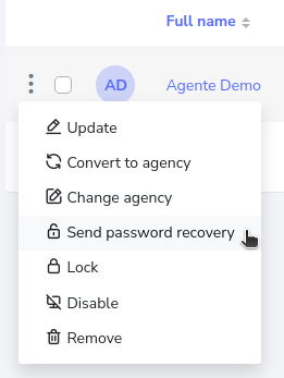 If you wish to send a password recovery email to an agent, just go to the agent list and find the agent you wish to do so, then click on the 3 dots button on the left side of the agent.