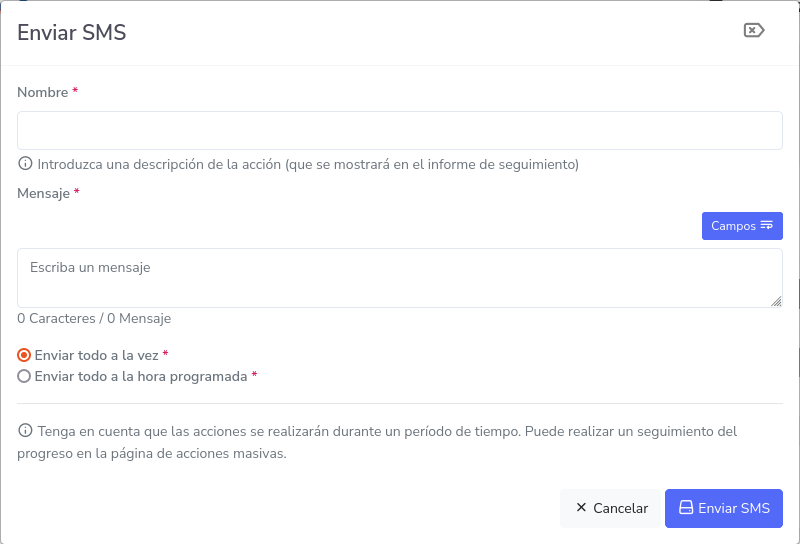 A pop-up window will appear where you will place the name of the message, or action that will help to track it, the message to be sent, whether you will send it immediately or on a specific date. After entering the information, proceed to send the SMS.