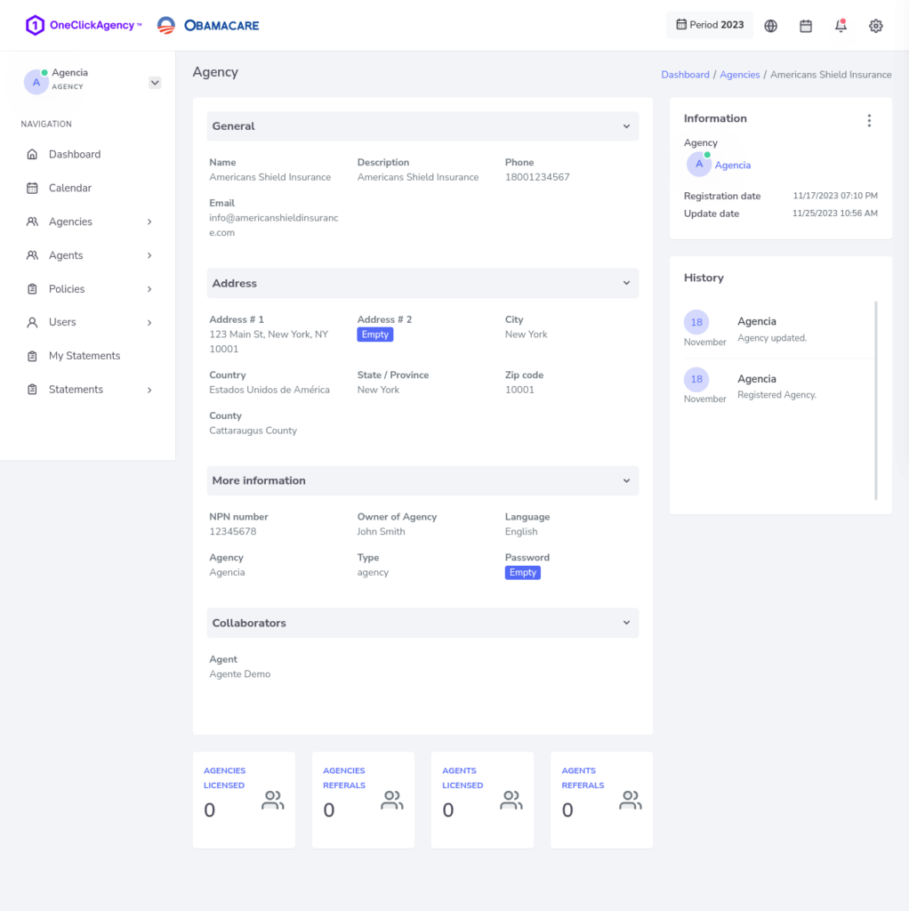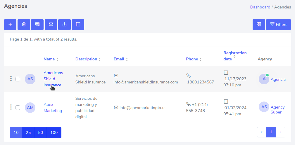 In order to see the details of an agency, it is only necessary to click on the name of the agency, in this way, you will have at your disposal all the details of the agency.